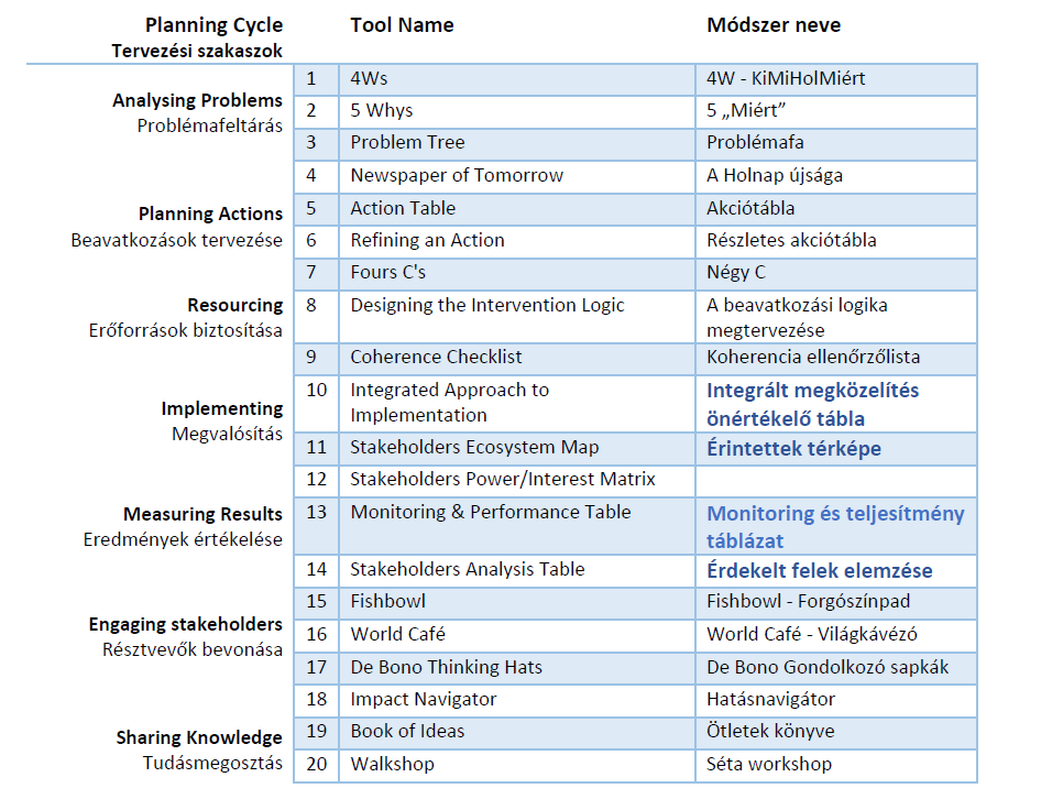A kiválasztott módszerek a tervezési ciklus összes állomását felölelik, segítségükkel a teljes folyamat végigkísérhető a problémák meghatározásától a monitoring szempontokig. A módszerek többsége a folyamat során többször is alkalmazható és több célt is szolgálhat.