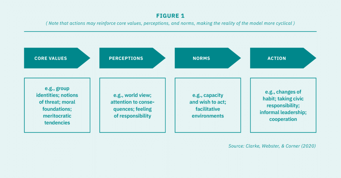 The analysis builds on the Core-belief model developed and tested in several countries by the agency More in Common. The aim is to better understand how we can balance different interests and motivations and succeed in finding solutions building on compromises that all can recognize and accept. A tool for finding such a balance is an understanding of the core beliefs and values at stake in the society – or locally in the communities. Values and culture are critical in making changes. Figure 1 shows that action is based on values, core beliefs, and norms.