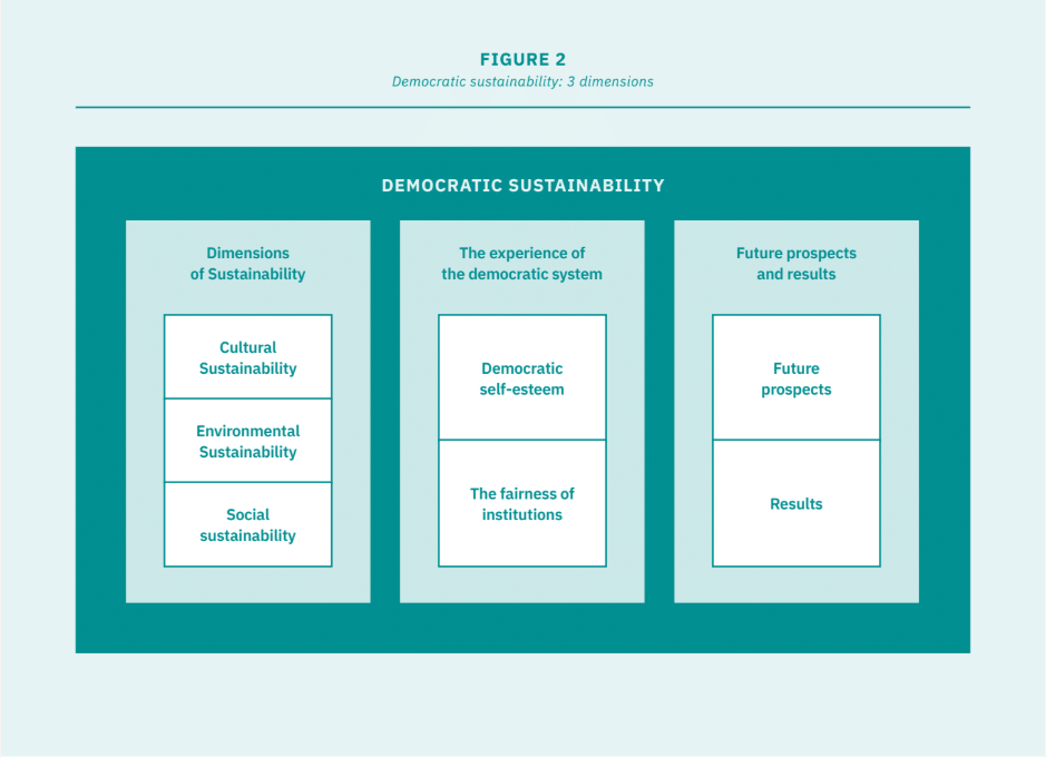 Another structure to be aware of is what different factors are needed to support a society in balance. A way to talk about this could be to divide the society on 3 dimensions: The first describing the different types or categories of sustainability we need to keep balance – this could be social, environmental and cultural sustainability. The second could be our experience of the democratic system consisting of our individual democratic self-esteem and how we experience the fairness of our institutions. And the third could be our individual faith in the future and belief in our ability to solve problems and create good results.
