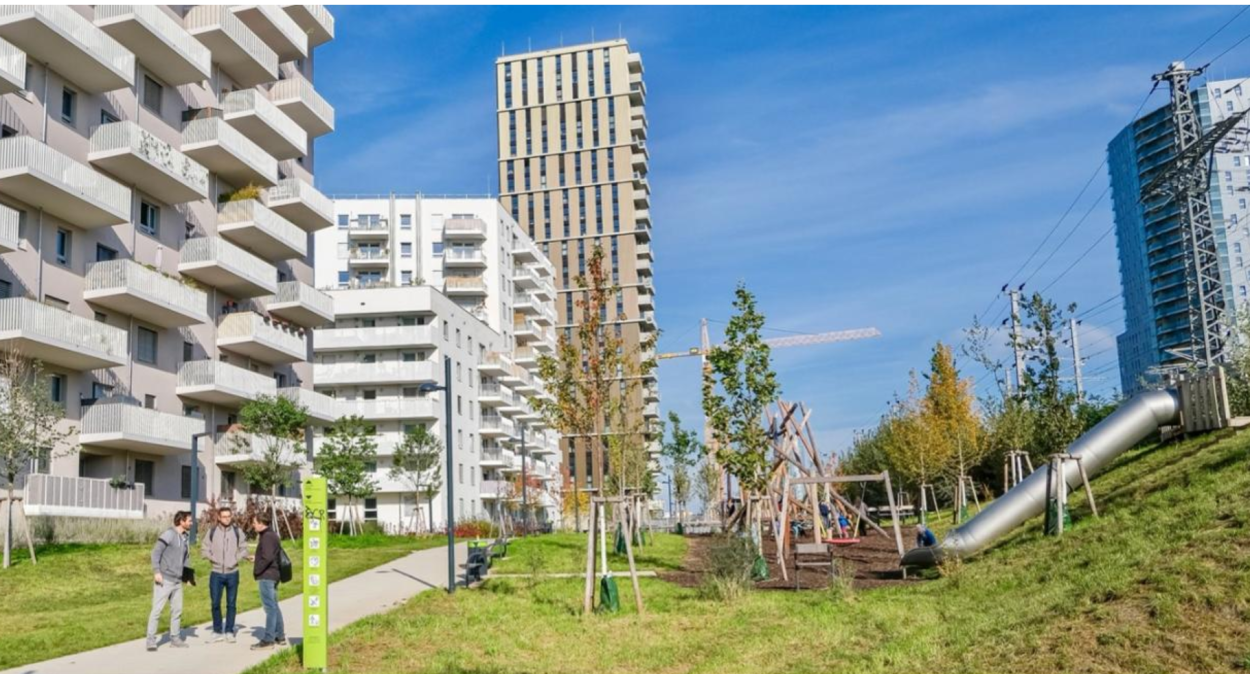 Un alt exemplu este Neues Landgut din districtul 10, care extinde această abordare. Dezvoltat pe un teren industrial dezafectat de 9 hectare, în apropierea Gării Centrale, cartierul va găzdui în curând aproximativ 4 000 de locuitori, jumătate dintre ei în locuințe accesibile ca preț. Conceptul urbanistic, complet fără trafic auto la nivelul străzii, se structurează în jurul parcului Walter-Kuhn-Park și al pieței Elisabeth-Sundt-Platz, ambele proiectate ca spații reziliente climatic, cu arbori de umbrire, elemente de apă și grădini de infiltrare care atenuează efectele valurilor de căldură, sprijină biodiversitatea și oferă locuitorilor spații de întâlnire și relaxare.
