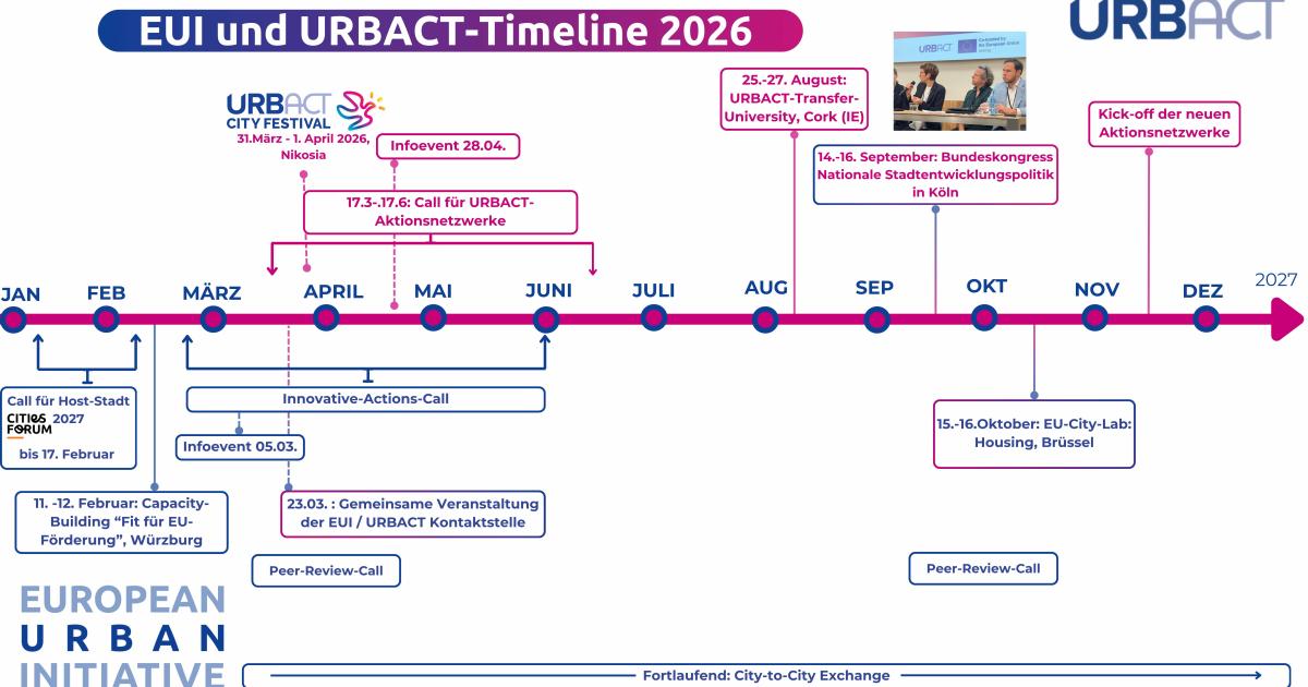 Bereits in den ersten zwei Monaten begann das Jahr mit einem EUI-Call zur Auswahl der Host-Stadt für das Cities Forum 2027 sowie dem EUI-Capacity-Building-Event „Fit für EU-Förderung“ in Würzburg. Daraufhin startet am 25. Februar der vierte Call für „Innovative Actions“ der Europäischen Stadtinitiative (EUI). Dieser ist bis Juni für innovative Bewerbungen, insbesondere von Klein- und Mittelstädten, geöffnet. Für alle Interessierten bietet die deutsche Kontaktstelle für URBACT und EUI eine Online-Informationsveranstaltung am 5. März 2026 an.