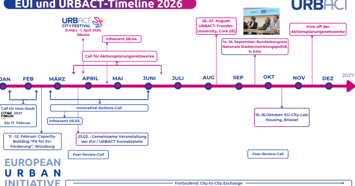 Hier finden Sie auch einseitige grafische Übersicht, die alle wichtigen Förderangebote und Calls von URBACT und EUI kompakt zusammenfasst – ideal zur schnellen Orientierung und Weitergabe im eigenen Haus. Wenn Sie in diesem Jahr nichts von URBACT und EUI nichts verpassen wollen abonnieren Sie unseren URBACT- und EUI- Newsletter.