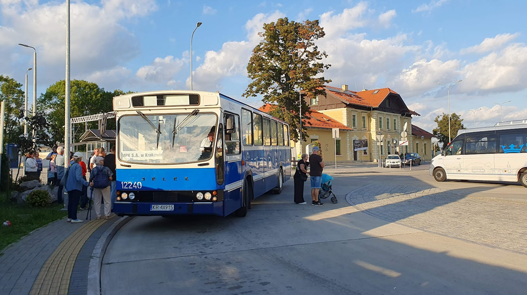 Skawina Main Station, the new pride and heart of the town: an integrated multimodal hub uniting transportation with a library, cafe, and community center. The photo shows a historic bus tour. Photo credit: Maciej Zacher