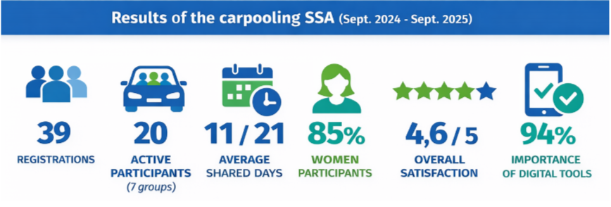 On average, groups were made up of 2.8 people per car and shared their commute on 11 of the 21 working days. Overall satisfaction was very high (4.6 out of 5), and almost everyone (94%) agreed that digital tools would be essential to expand carpooling in the future.