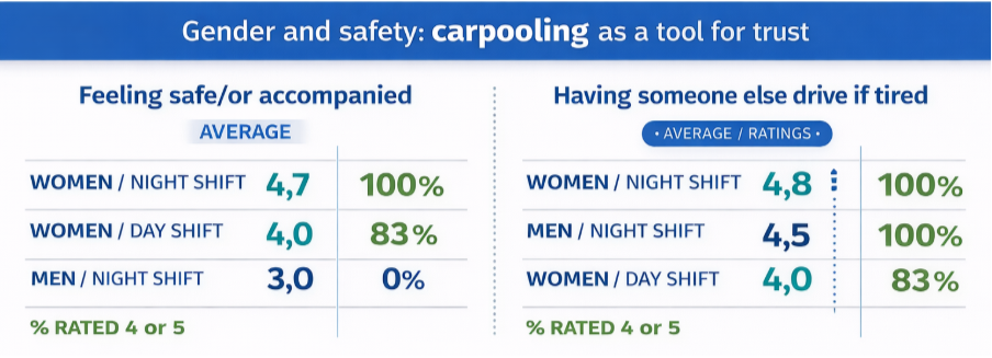 Similarly, when asked about the value of having someone else drive when feeling tired, all women and men commuting at night rated this very highly (4.5–4.8), showing how trust and mutual support are integral to carpooling behaviour.