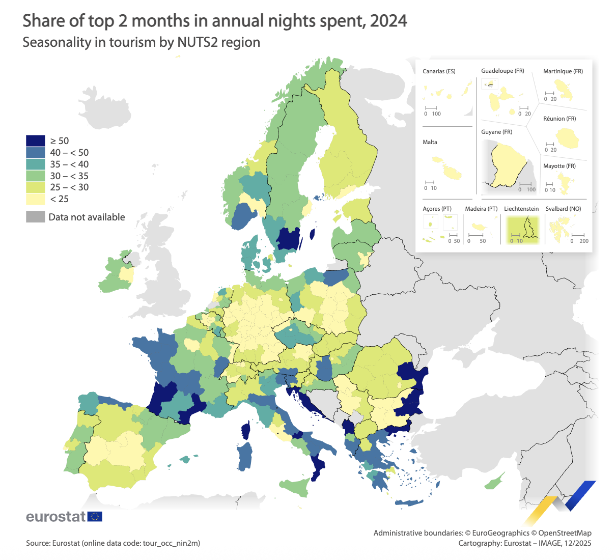 At the regional level, 1 in 6 EU NUTS 2 regions concentrate more than 40 percent of their annual tourism nights in the top two months. Coastal regions are among the most seasonal, while capital regions tend to be more balanced.