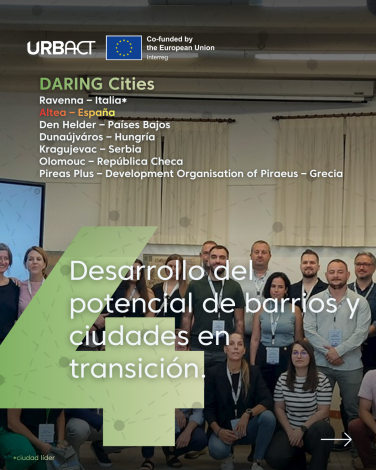 Tecnologías digitales para la transición urbana (Red ITN) Esta Innovation Transfer Network (ITN) adapta la experiencia del proyecto "DARE" de Rávena (Italia) para facilitar la transición urbana. El enfoque se centra en el uso de datos, el storytelling digital y la participación ciudadana para transformar barrios, convirtiendo a los vecinos en agentes activos del cambio urbano.