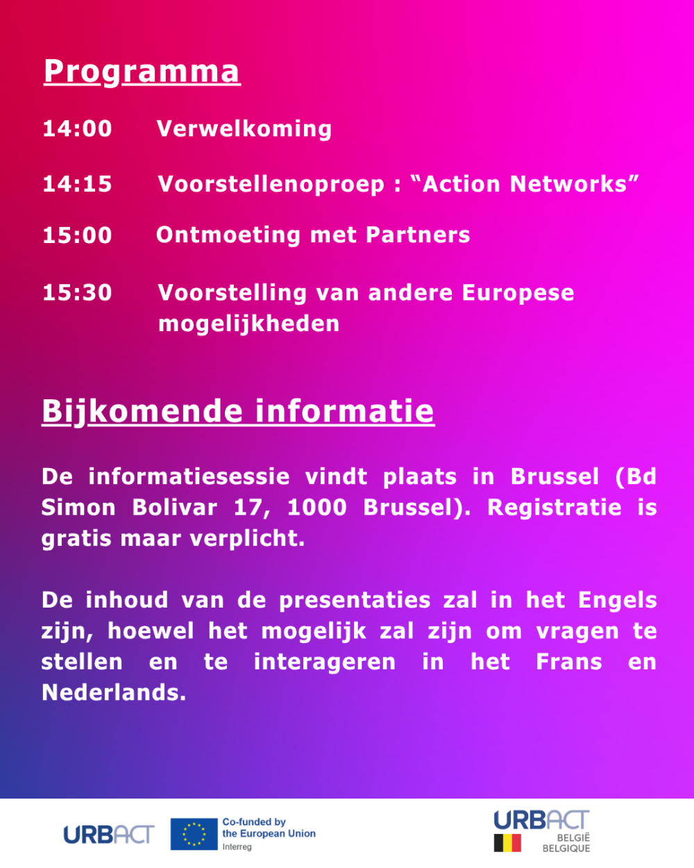 De Belgische infosessie biedt de gelegenheid om kennis te maken met het nieuwste type URBACT-netwerken en de mogelijkheden die de oproep biedt.