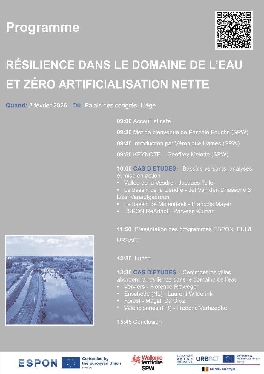Nous avons le plaisir de vous inviter à un événement consacré à la Résilience dans le domaine de l'eau et au Zéro Artificialisation Nette (ZAN), qui se tiendra le 3 février 2026 à Liège.