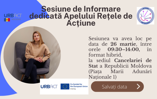 Vă invităm să participați la sesiunea dedicată Apelului URBACT Rețelele de Acțiune, care se va desfășura pe 26 martie, între orele 09:30–14:00, în format hibrid, la Cancelaria de Stat (strada Piața Marii Adunări Naționale 1).