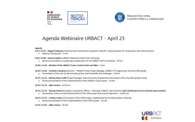 Ambasada Franței în România alături de Ministerul Dezvoltării, Lucrărilor Publice și Administrației, vă invită să participați la un webinar dedicat Programului URBACT, organizat în contextul apelului de proiecte deschis în perioada 17 martie – 17 iunie 2026.