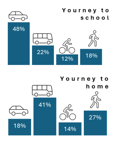 The findings were revealing. We knew that nearly one-third of students are living within one kilometre of school — a comfortable 15- minute walk — and 80% within three kilometres. Yet almost half (48%) still arrive by car. Only 18% walk, 12% cycle, and 22% use public transport. Interestingly, significantly more people used public transportation (41% of respondents) and walked (27%) when going home, indicating that many families drive their children to school simply for convenience, not because of a lack of alternatives.