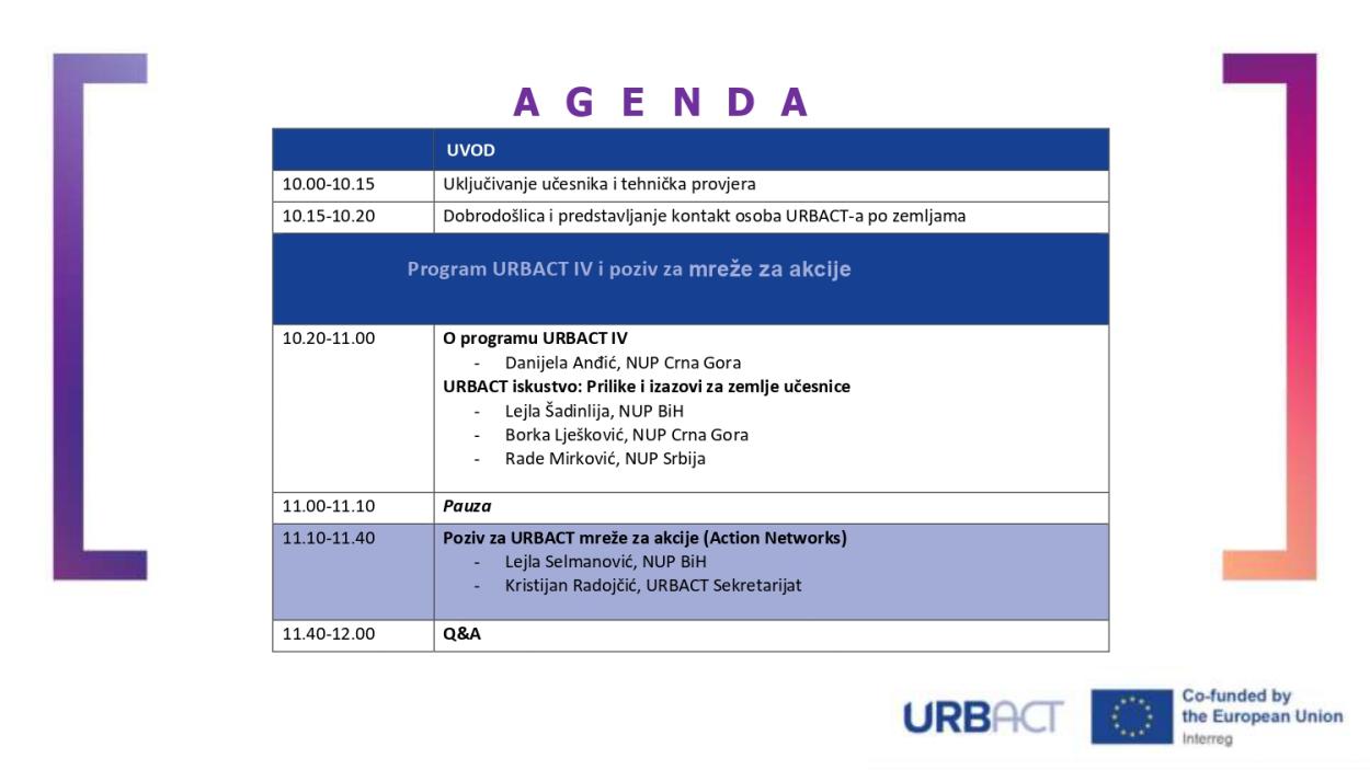 Za više informacija o URBACT programu i aktuelnim prilikama, pratite zvanične kanale komunikacije - društvene mreže i web stranice - NUP-ova BiH, Crne Gore i Srbije.