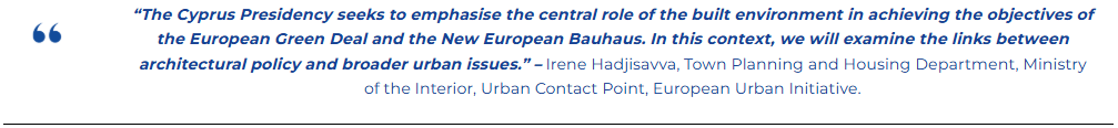 În acest context, Președinția Ciprului va organiza reuniuni cu Directorii Europeni pentru Arhitectură, precum și alte evenimente la nivel înalt, pentru a promova dimensiunea europeană a politicilor privind locuirea accesibilă, continuând direcțiile promovate de Președinția Danemarcei.