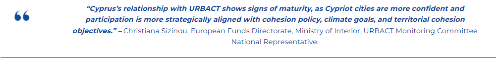 De-a lungul timpului, implicarea Ciprului în URBACT a evoluat, depășind rolul de simplu punct de acces la cooperarea urbană europeană și devenind un veritabil instrument de consolidare a capacității locale. Dincolo de Nicosia, participarea orașelor mici și mijlocii din întreaga insulă a transformat URBACT într-o oportunitate de învățare și formare pentru administrații locale care se confruntă adesea cu resurse și personal limitate.