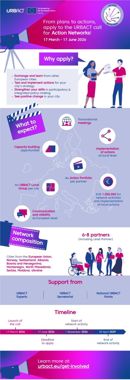 Poziv za Mreže za akcije omogućava implementaciju strategija gradova kroz niz konkretnih aktivnosti za održivi urbani razvoj u lokalnim sredinama. Gradovi iz 27 država članica Evropske unije i partnerskih država (Norveška, Švicarska, Albanija, Bosna i Hercegovina, Crna Gora, Sjeverna Makedonija i Srbija, Moldavija i Ukrajina) su pozvani da se prijave na ovaj poziv za Mreže za akcije.