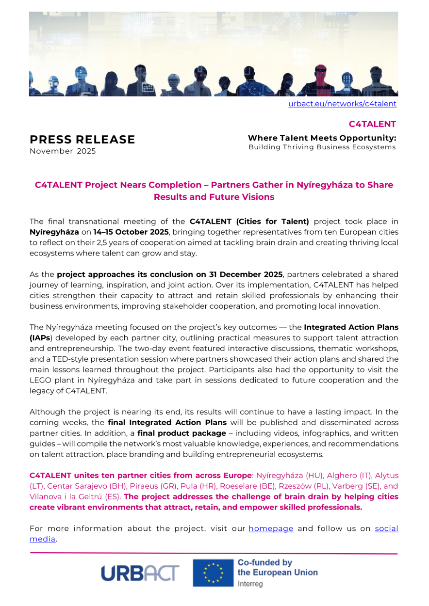 Final network meeting in Nyíregyháza, Hungary. C4TALENT is nearing completion. Submitted by on 03/11/2025 Zoltán Szenes See all articles