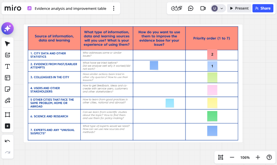 The Evidence Analysis and improvement table can be uploaded in an online collaborative whiteboard platform (such as Miro, Mural...) or in a Google sheet and participants can then fill in the table thanks to virtual sticky notes.