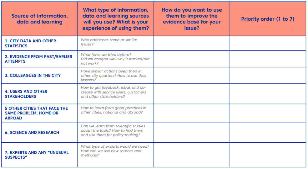The EVIDENCE ANALYSIS & IMPROVEMENT TABLE aims to identify, gather and analyse sources of relevant information to get a proper and complete overview of the issue.