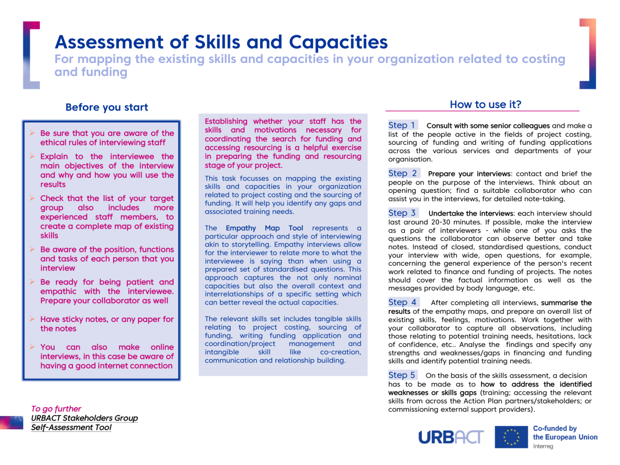 The ASSESSMENT OF SKILLS AND CAPACITIES aims to establish wether the staff of your organisation has the skills and motivations necessary to do the relevant tasks involved in coordinating the search for funding and accessing resources.