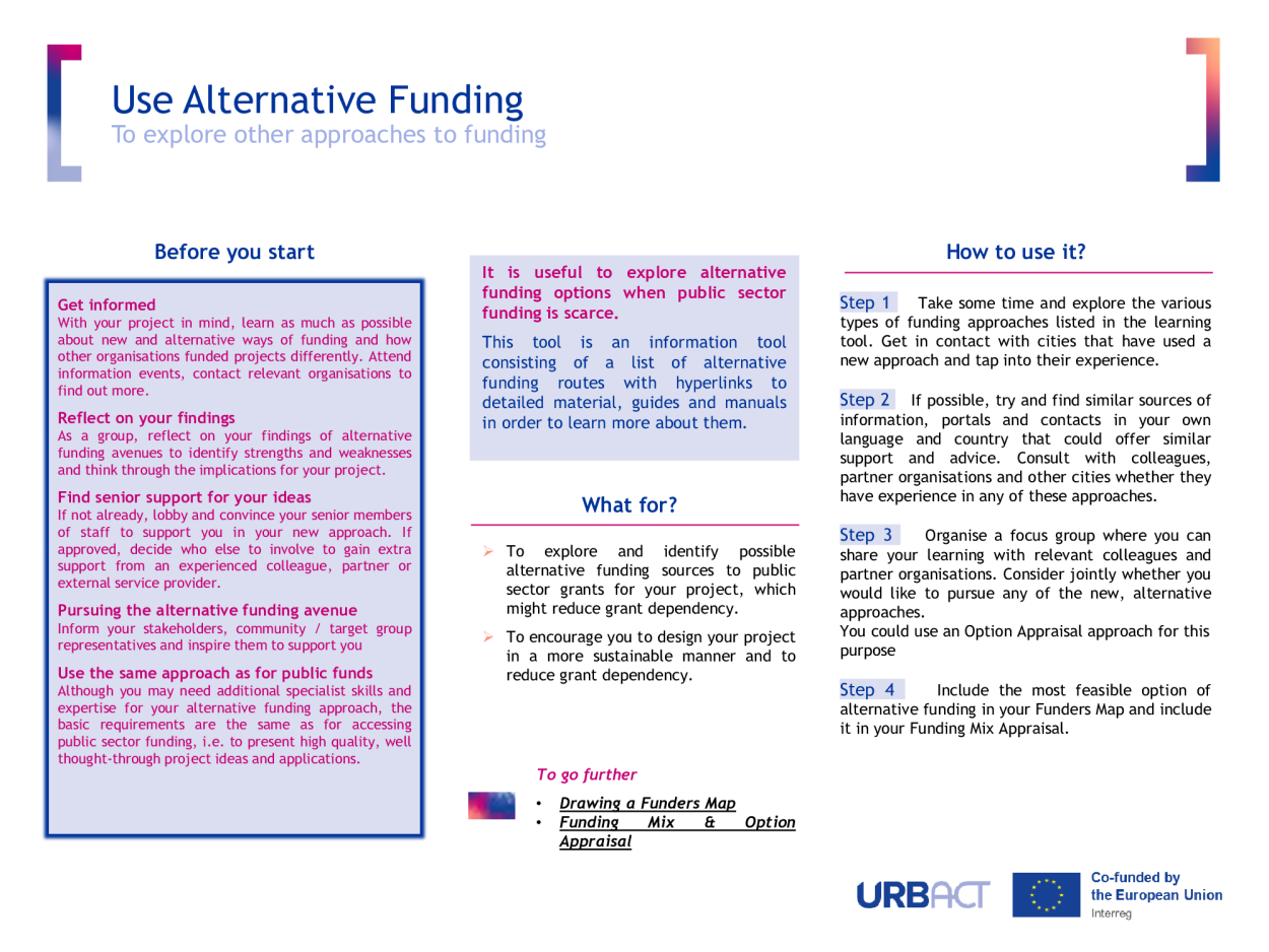 This is an information tool consisting of a list of alternative funding routes with hyperlinks to detailed material, guides and manuals for learning more about them.