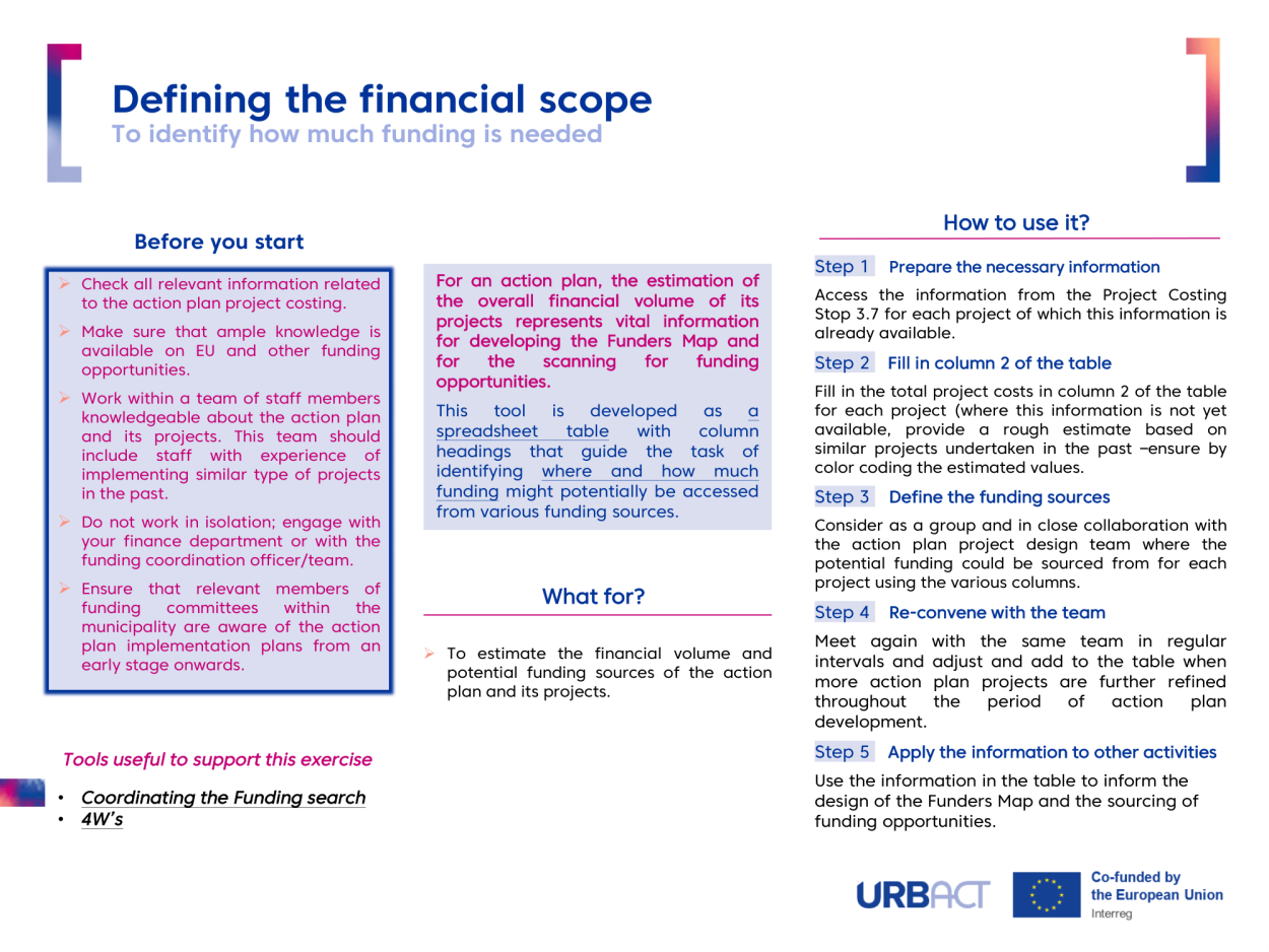 DEFINING THE FINANCIAL SCOPE aims to estimate the financial volume and potential funding sources of your plan and its projects.