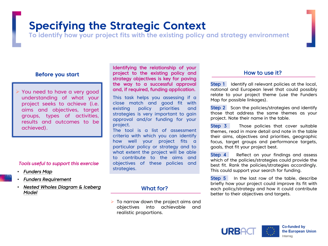 The tool is a list of assessment criteria with which you can identify how well your project fits a particular policy or strategy and to what extent the project will be able to contribute to the aims and objectives of these policies and strategies.