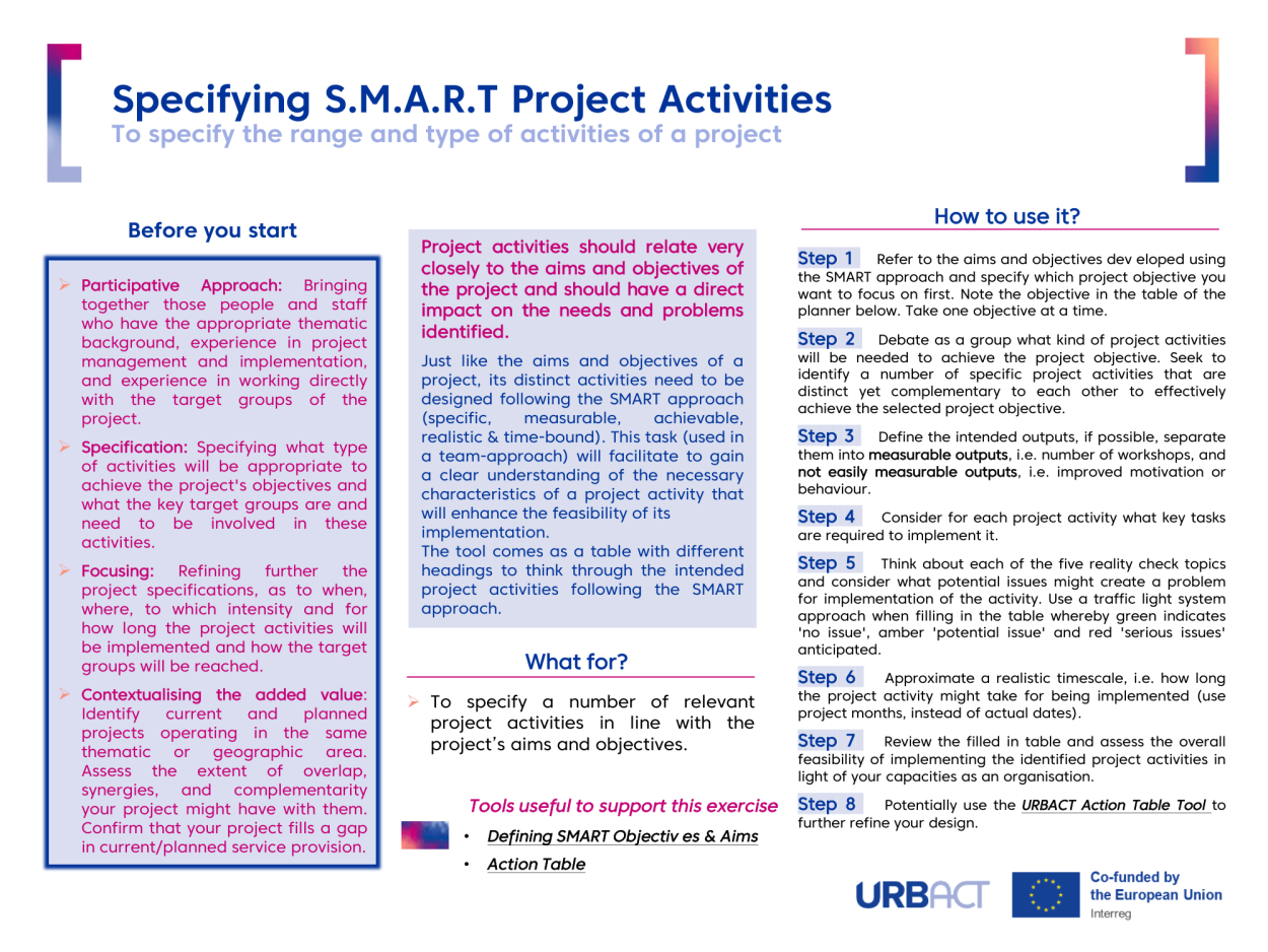 The tool consists of a table that includes the relevant headings to think through the intended project activities following the SMART approach.