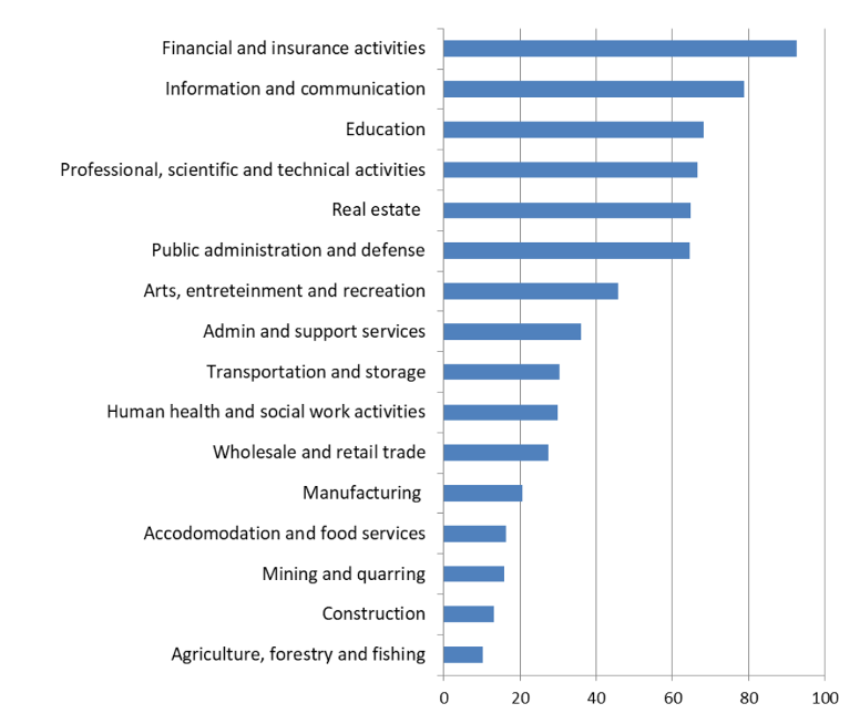 Not all jobs can be done remotely. The Joint Research Centre’s assessment of “teleworkable” occupations found that remote work potential is highest in financial and insurance activities, information and communication, education and professional, scientific and technical activities, real estates and public administration and defense. Workers in hospitality, manufacturing, retail, care and many public-facing services have far fewer opportunities to work from home.